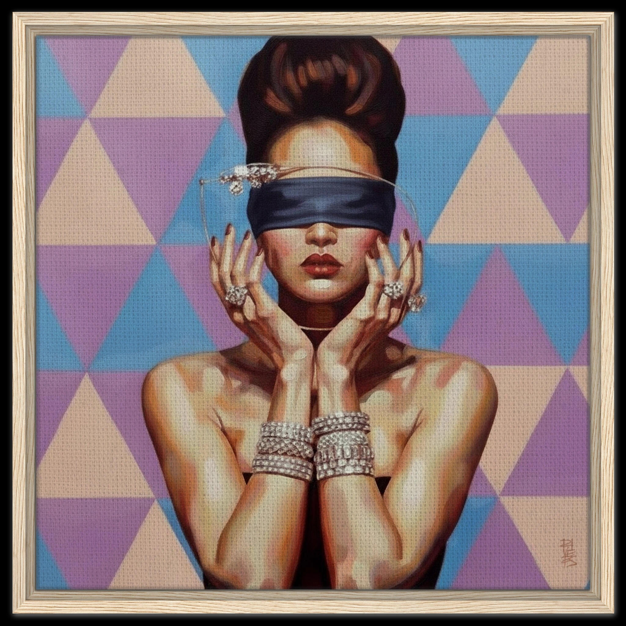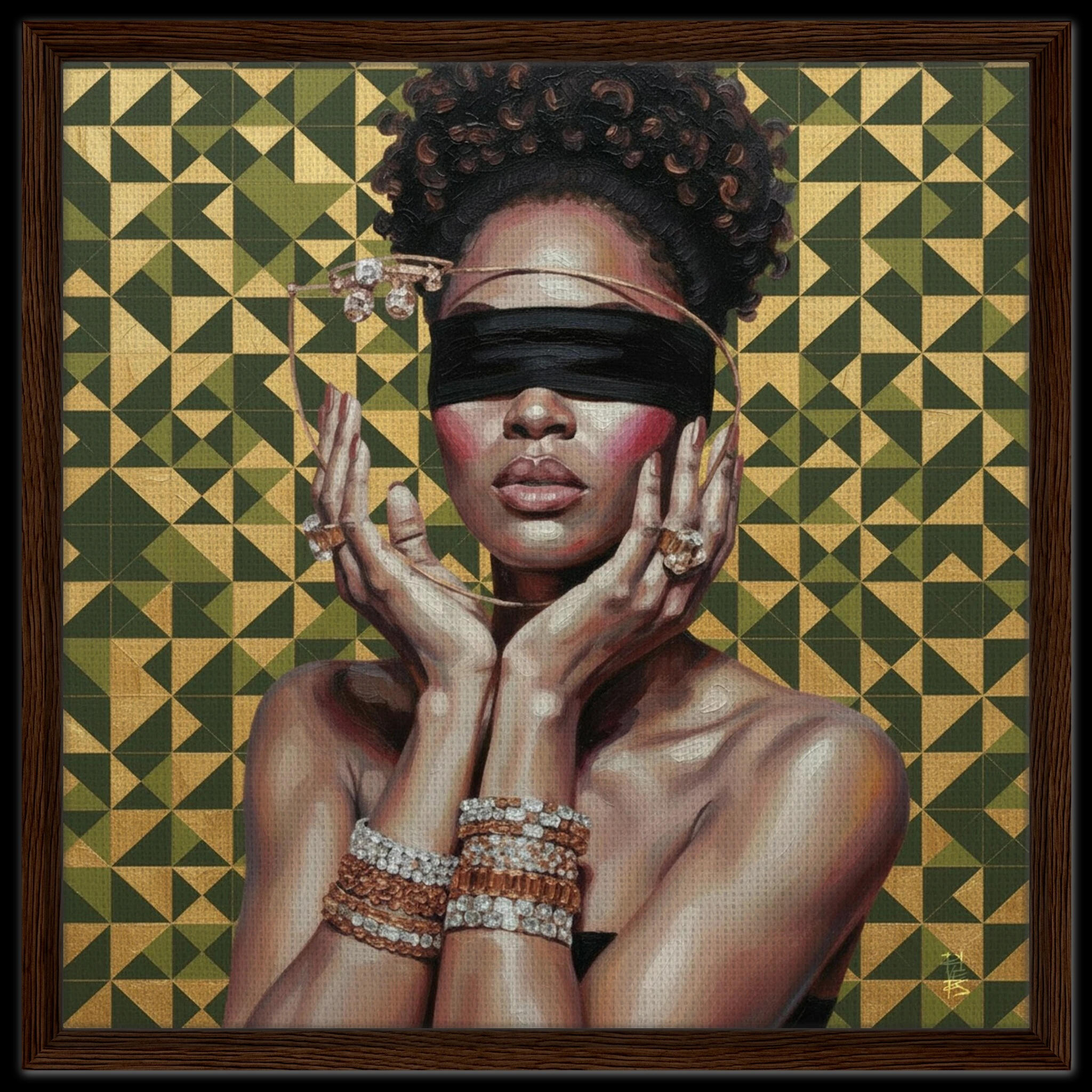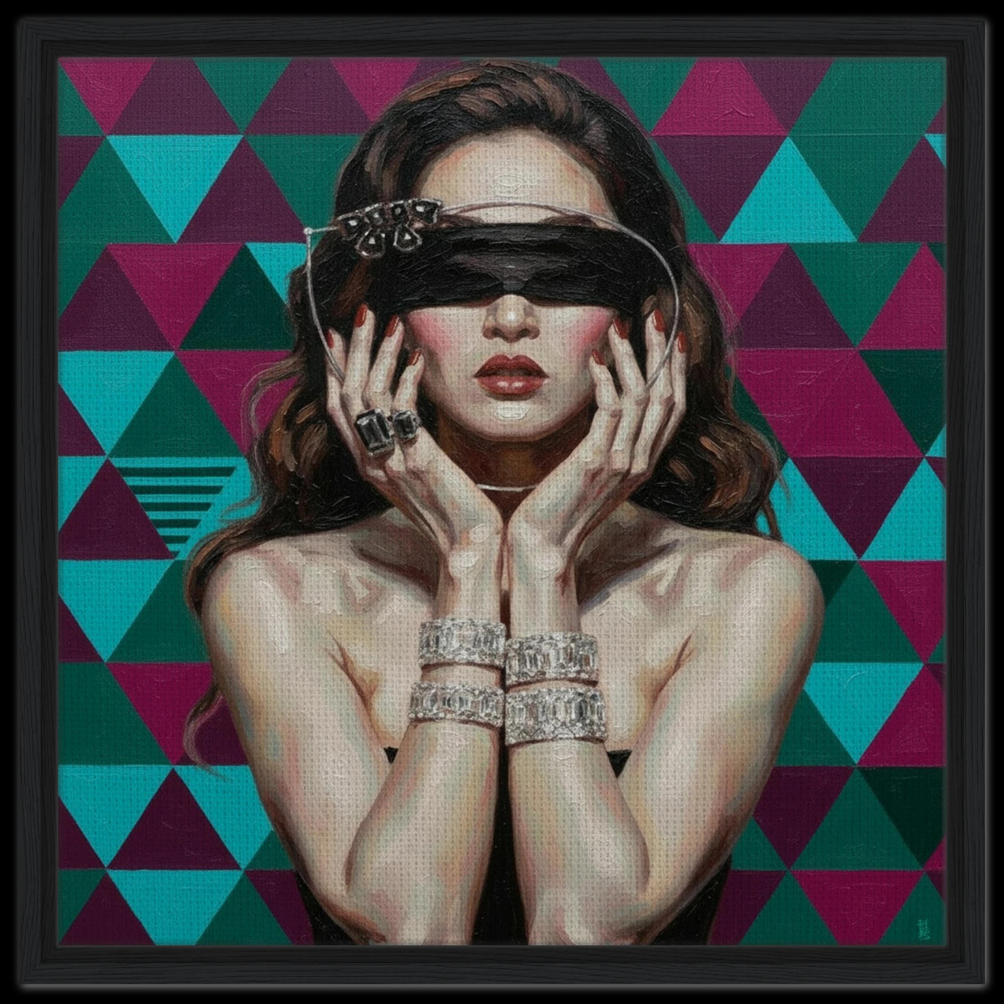 This piece challenges the common understanding of sight. Against a visually arresting, high-contrast geometric field, the subject's veiled gaze represents a deliberate refusal of superficial input. It suggests that Vision is not merely a physical capacity, but a matter of conscious selection—a choice to ignore the loud, distracting patterns of the material world and seek clarity in a different light. The elaborate bracelets serve as a physical paradox, highlighting the objects of value the figure chooses not to acknowledge.