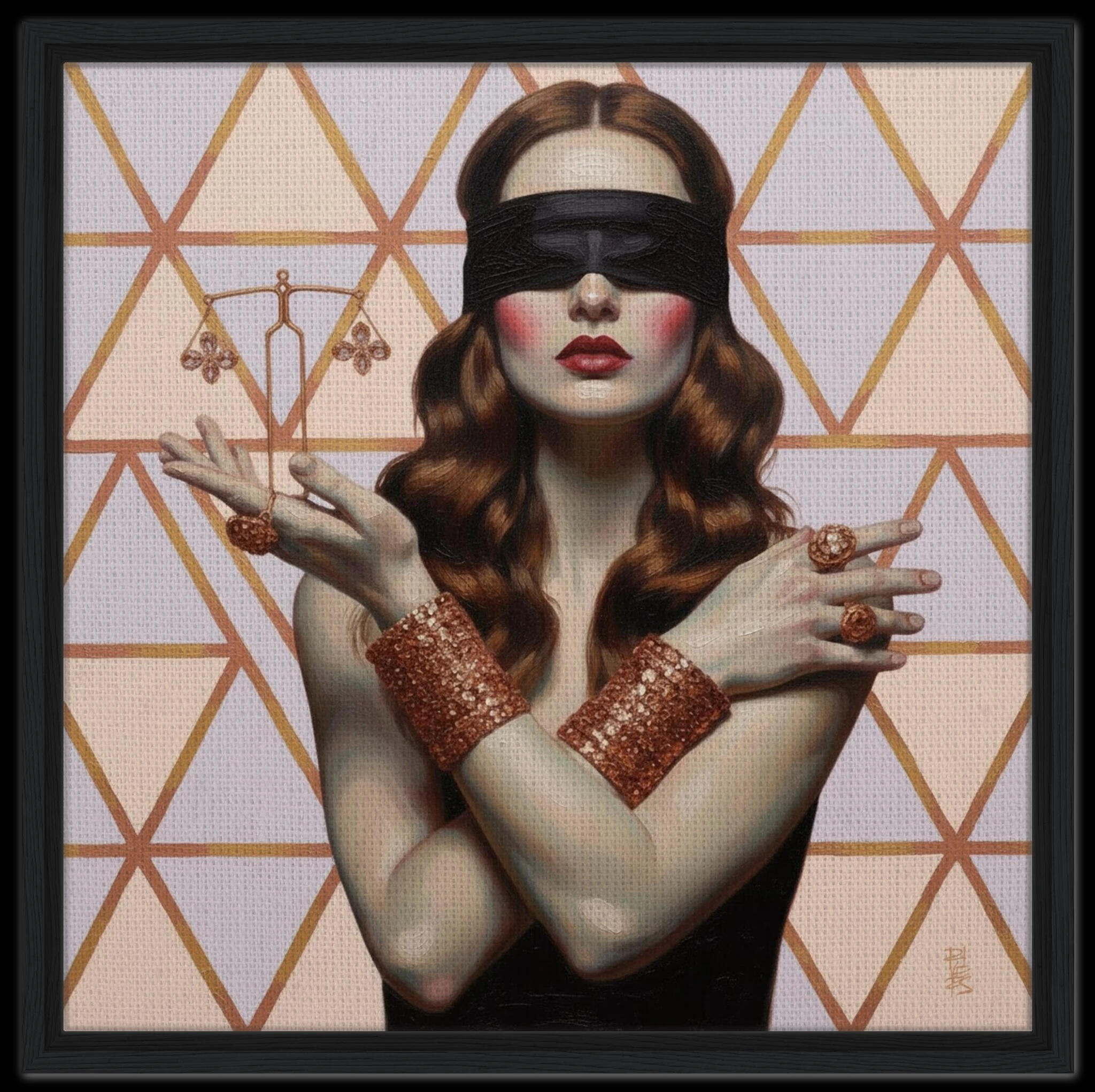 Here, the scales are presented not as tools of commerce, but as instruments for philosophical assessment. This painting investigates the act of Measure, asking what true worth should be—character, principle, or wealth? The figure, stripped of visual judgment, engages in a silent weighing of internal values against external opulence, represented by the gold-toned background. It is a striking commentary on the burden placed upon society to constantly quantify value based on visible, material standards.